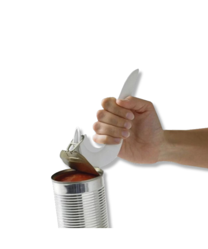 O Abre-Latas CanKey possui uma ponta pontiaguda especialmente concebida para permitir a remoção das tampas das latas com segurança, conforto e apenas com uma mão.